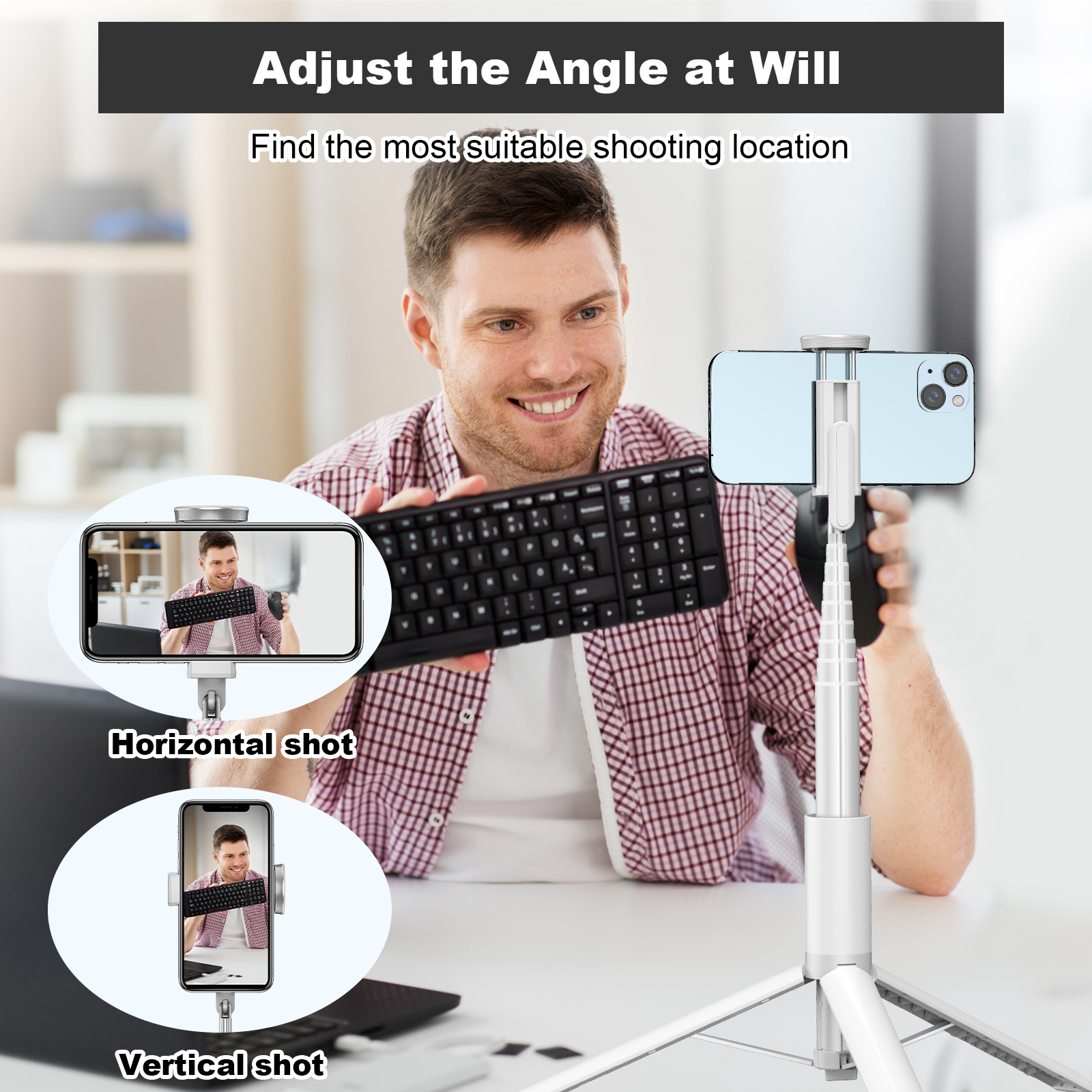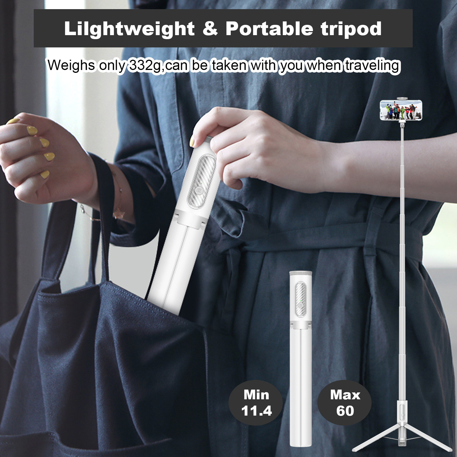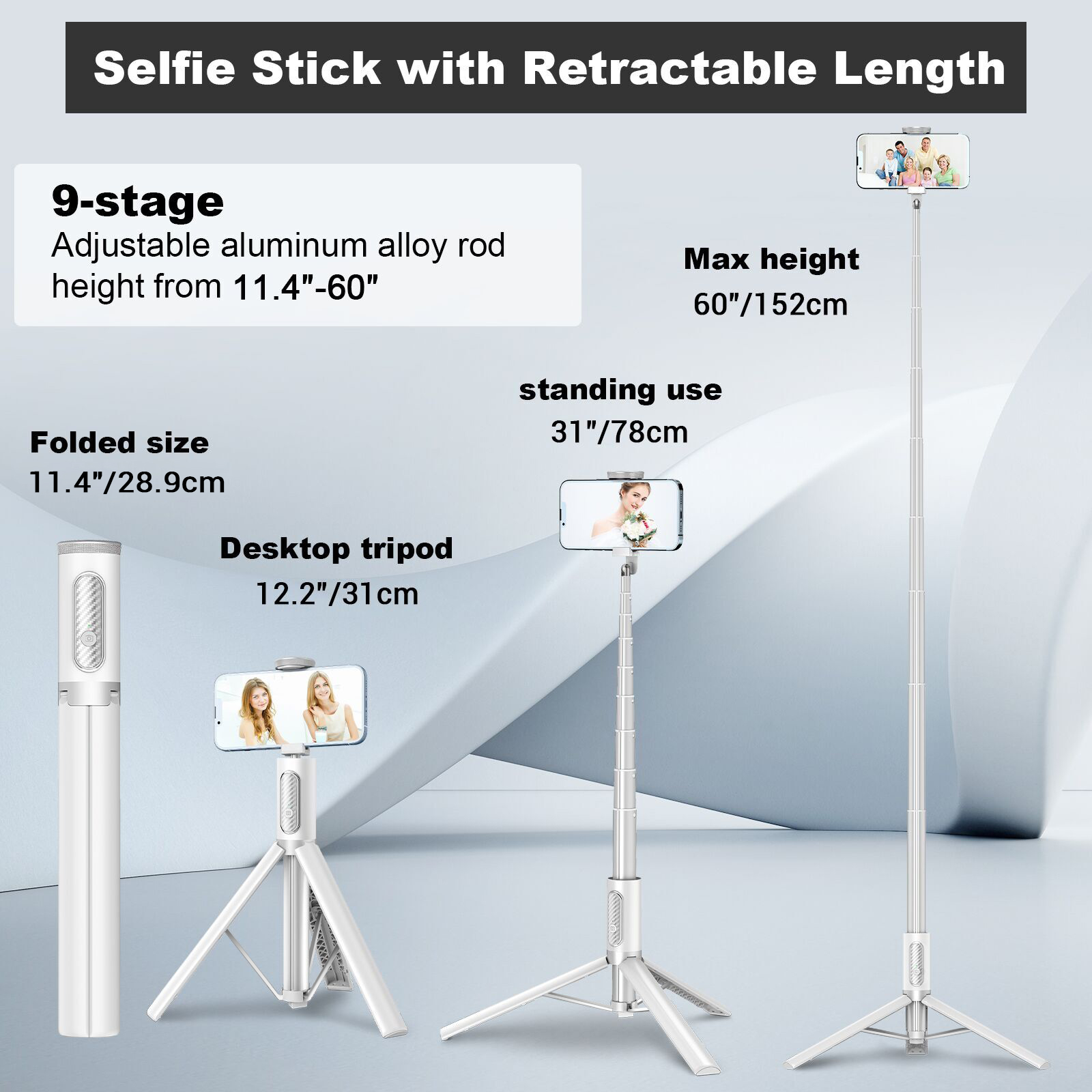 TONEOF 60 In Tripod, Cell Phone Selfie Stick, All-in-1 Stand with Integrated Wireless Remote, Lightweight and Portable, Extendable Tripod for 4-7 Inch iPhone and Android(White)