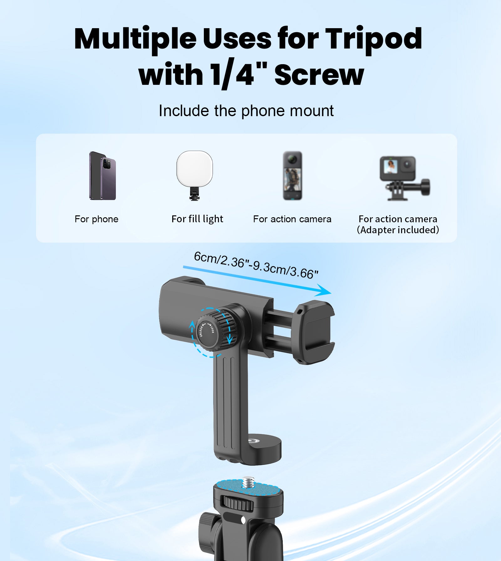 All-in-1 Design: The 1 button unlock tripod design, no need for tedious installation steps, just press the button and pull the rod to use it easily. It's great for selfies, group photos, videos, live streaming, travel, volgging. TONEOF phone tripod/hand-held monopod equipped with a 1/4" screw, is not only suitable for iPhone / Android cell phone, but also compatible with gopro/insta 360/DJI action camera