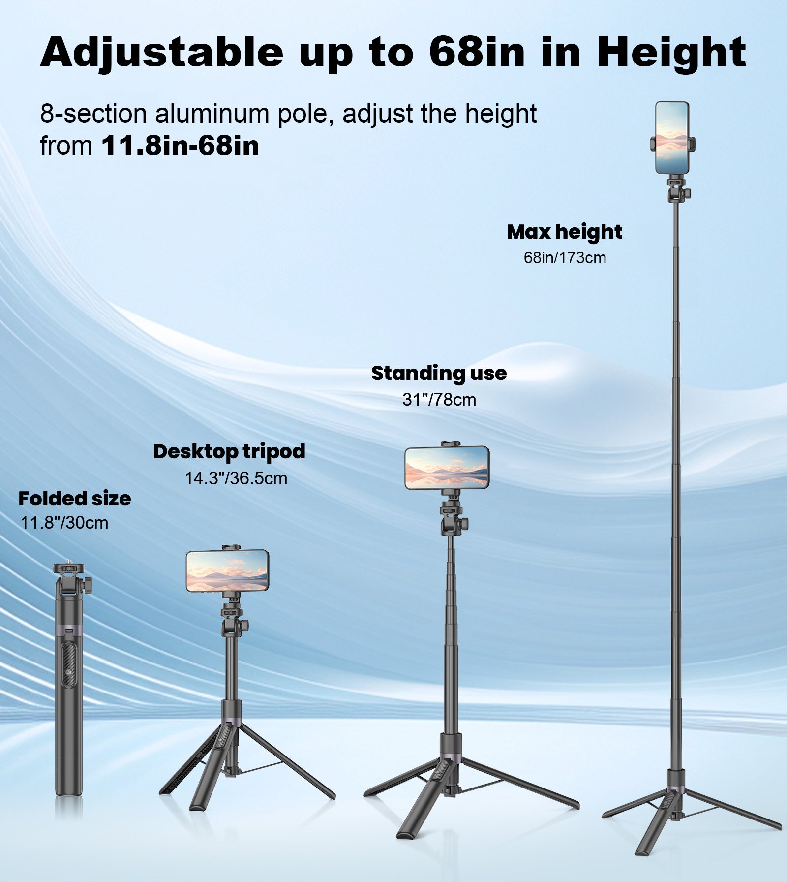 Extends up to 68" tall: The tripod for phone consists of a 8-section retractable aluminum alloy pole that can be quickly adjusted from 11.8 inches to 68 inches in height, providing the flexibility to take great photos at different heights and angles. It can be switched between modes such as desktop tripod, floor tripod, selfie stick and monopod. Aluminum alloy telescopic pole makes the tripod more sturdy and stable