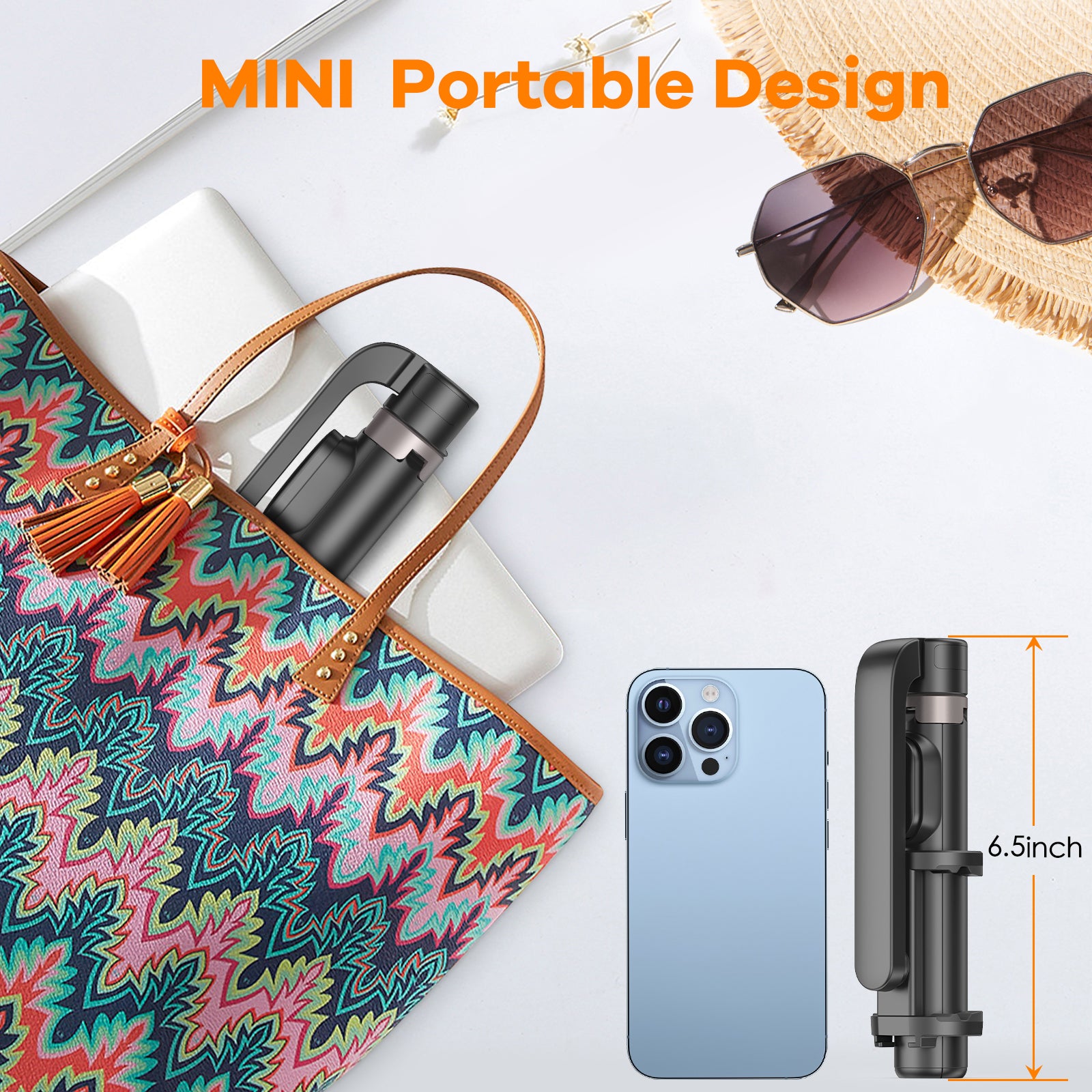 - 【Lightweight & Pocket Size MINI Selfie Stick for Cell Phone】The selfie stick tripod use the six-section stretching stick to take telephotos,the Maximum stretch length can be 27.6inches(70cm), great for Selfies, Group Photos, Face-time, Life-Vlog, Video shooting, Social life, etc.It is extremely compact when folded up, only 6.5 inches 5.6ounce, very light to carry, fits perfectly in a handbag ready to use whenever.
