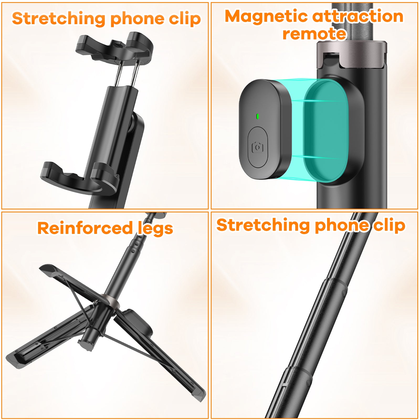 - 【Reinforced Tripod Base】This is a nifty piece of kit, not only a selfie stick but can also be converted very easily into a phone stand. Pull all 6 sections telescopic rod (or the thickest one at the bottom) apat, open the three legs to get a tabletop tripod for convenience of hands free selfies and Facetime/video calling. The base of the newly upgraded cellphone tripod adopts a reinforced design with a silicone non-slip foot pad, which is more stable after unfolding and is not easy to shake.