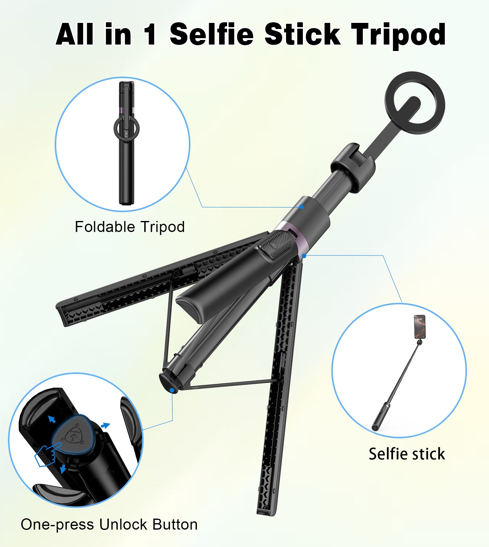 Portable All-in-1 Design:Combining a tripod for cell phone, selfie stick, and magnetic phone holder into one compact device, this item is designed for portability and convenience. This portable tripod weighs only 13 ounces (320 grams) and folds down to just 11 inches, making it easy to carry in your bag or backpack. Whether you're traveling, hiking, or exploring the city.