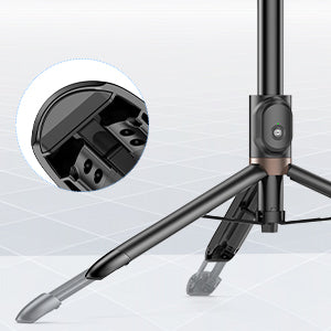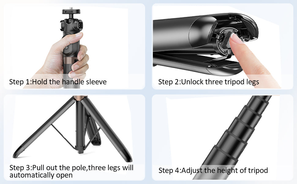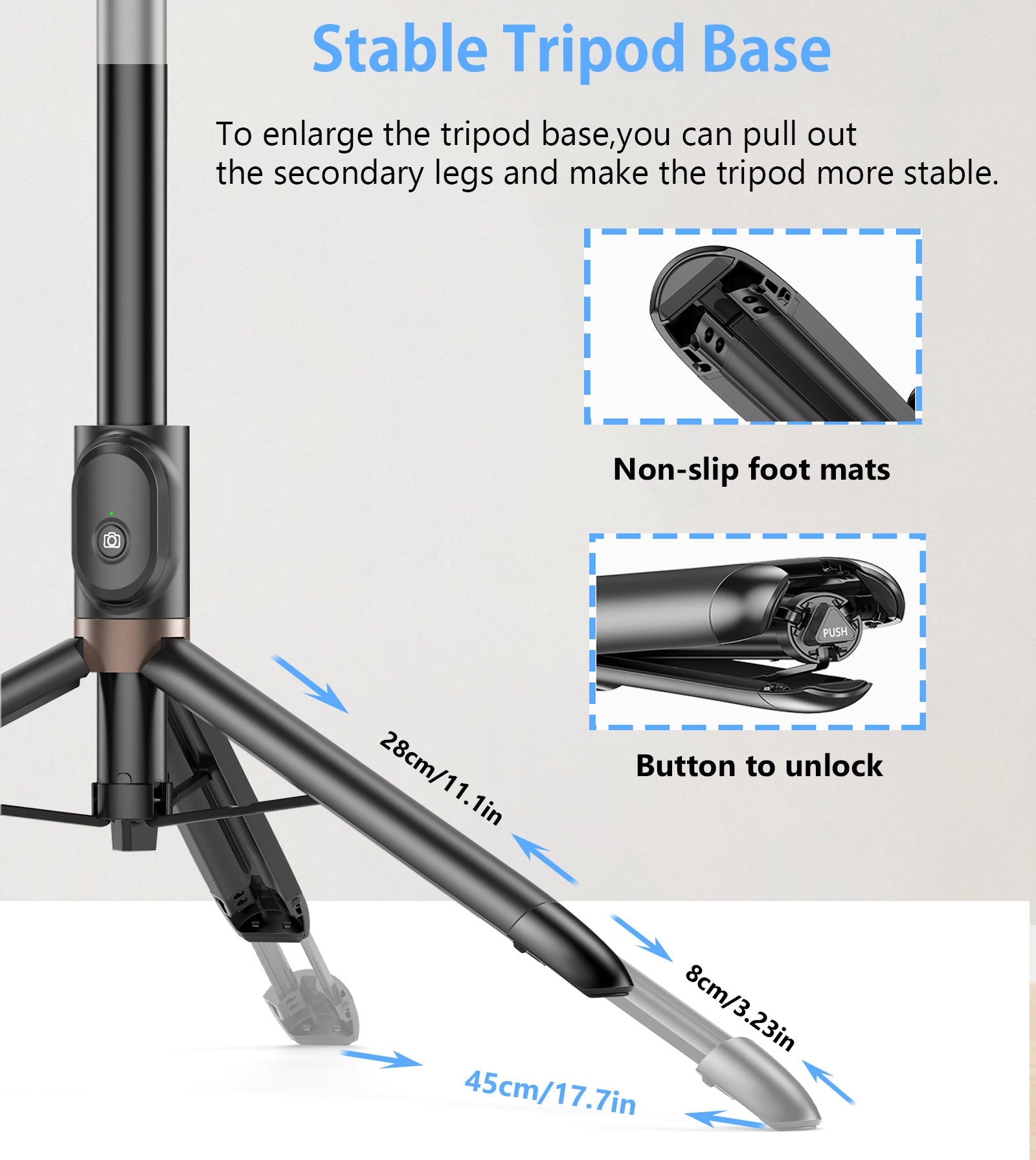- [Stronger Stability] One button unlock can open the three legs of the camera tripod, then you can pull out the secondary legs to increase the length of the three legs. This effectively expands the tripod for iphone base area and enhances the stability of the cellphone tripod. In addition, there are silicone foot pads on each leg to prevent sliding and keep the phone mount tripod stable.