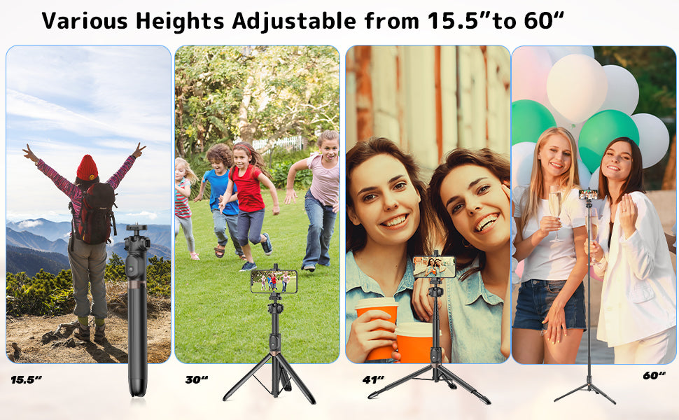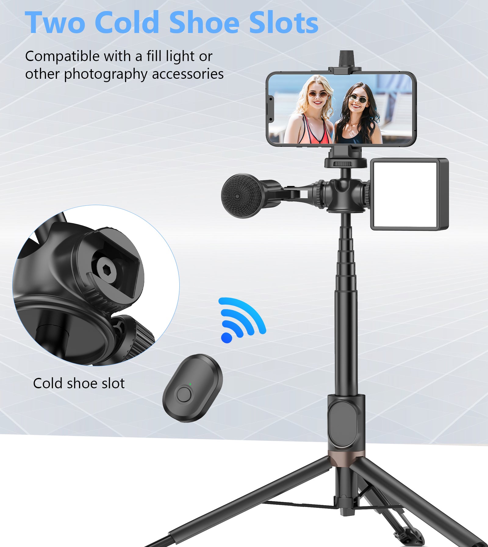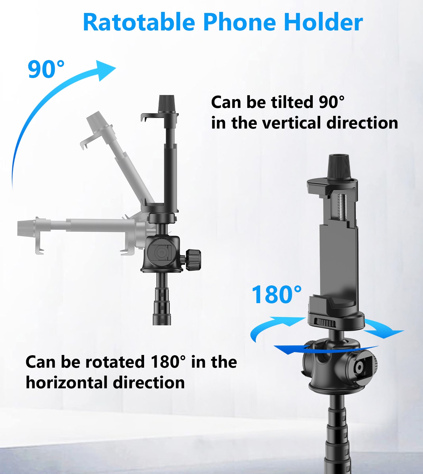 - [Two Cold Shoe Ports]The height of the tripod for cell phone with aluminum telescopic pole can be extended from 15.5" to 60",simply pull upward to adjust the height.There are two cold shoe ports on both sides of the phone tripod mount, which can be used to install microphone, fill light and other devices to make photos more professional.