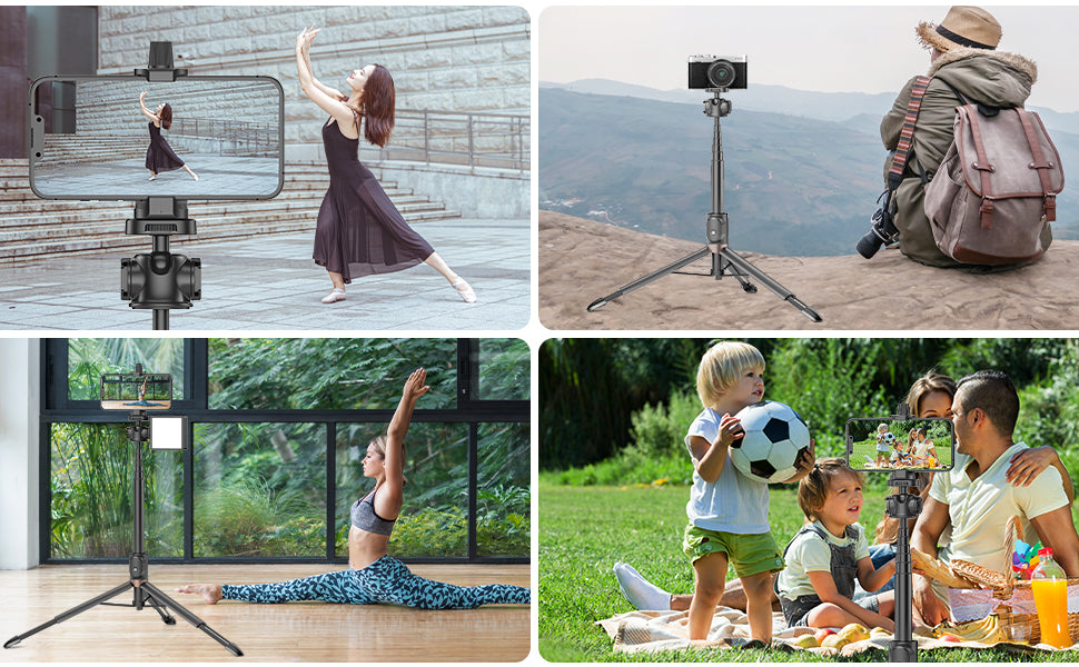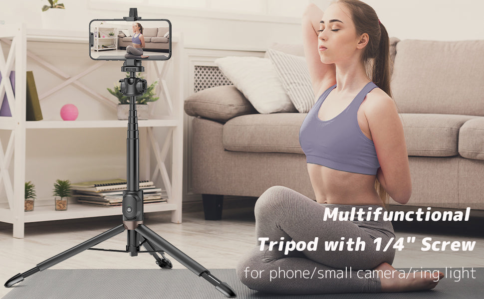 - [ 1/4”Screw Wide Application] This phone tripod stand has 1/4”screw,can be mounted on many different types of equipment with 1/4”screw hole, including phone holders, small cameras, webcams, ring lights and monitors. Moreover, this phone tripod with remote is perfect for taking photos, face-to-face and more. It can be used in different scenes such as video recording, group photos, traveling, family photos, online meetings, etc.